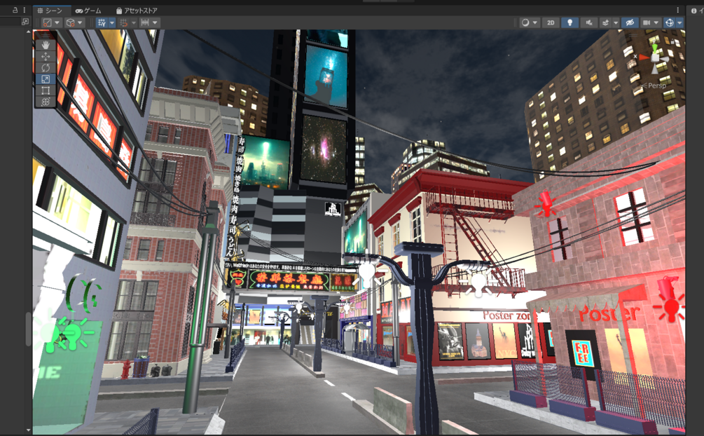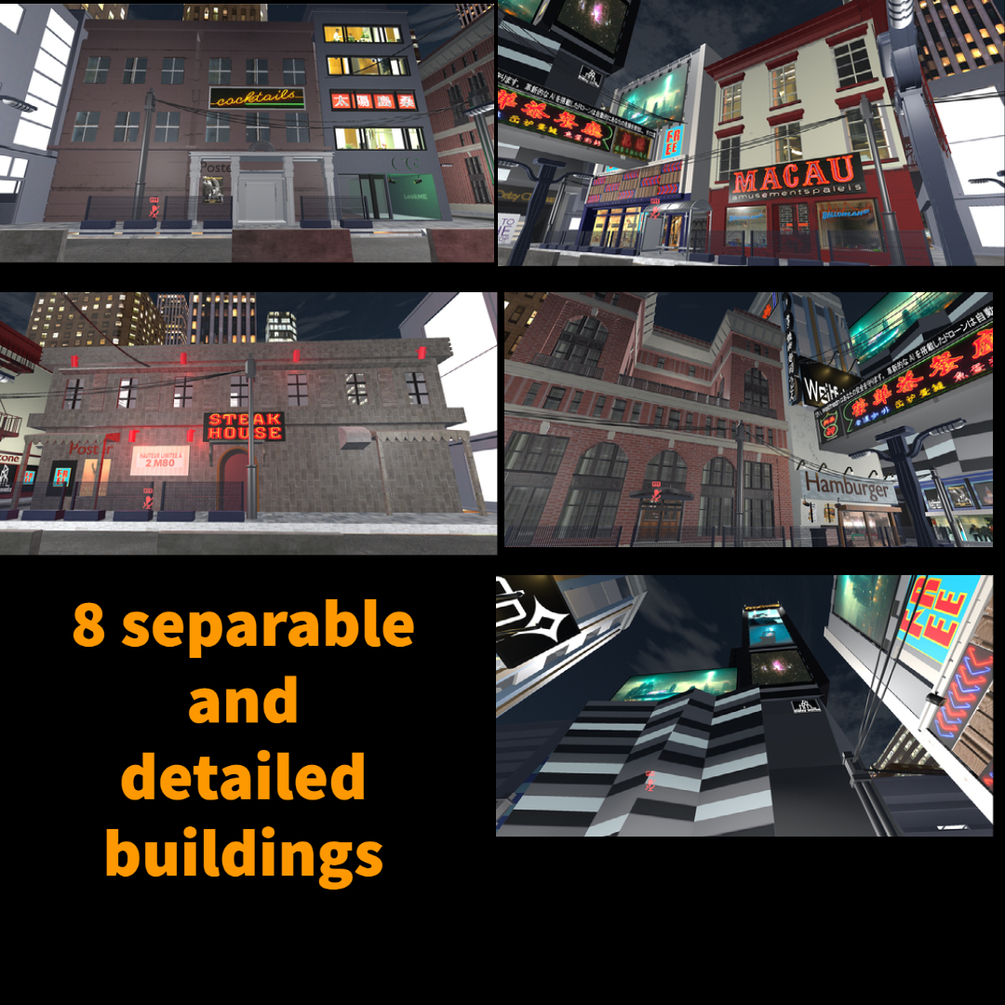 This 3D model has been created with the image of a multinational city. You can use the sample world as is, or separate each object and use it in your own project, it also has a gimmick to teleport to the rooftop. It is pre-configured for VRChat and compatible with SDK3/VCC.